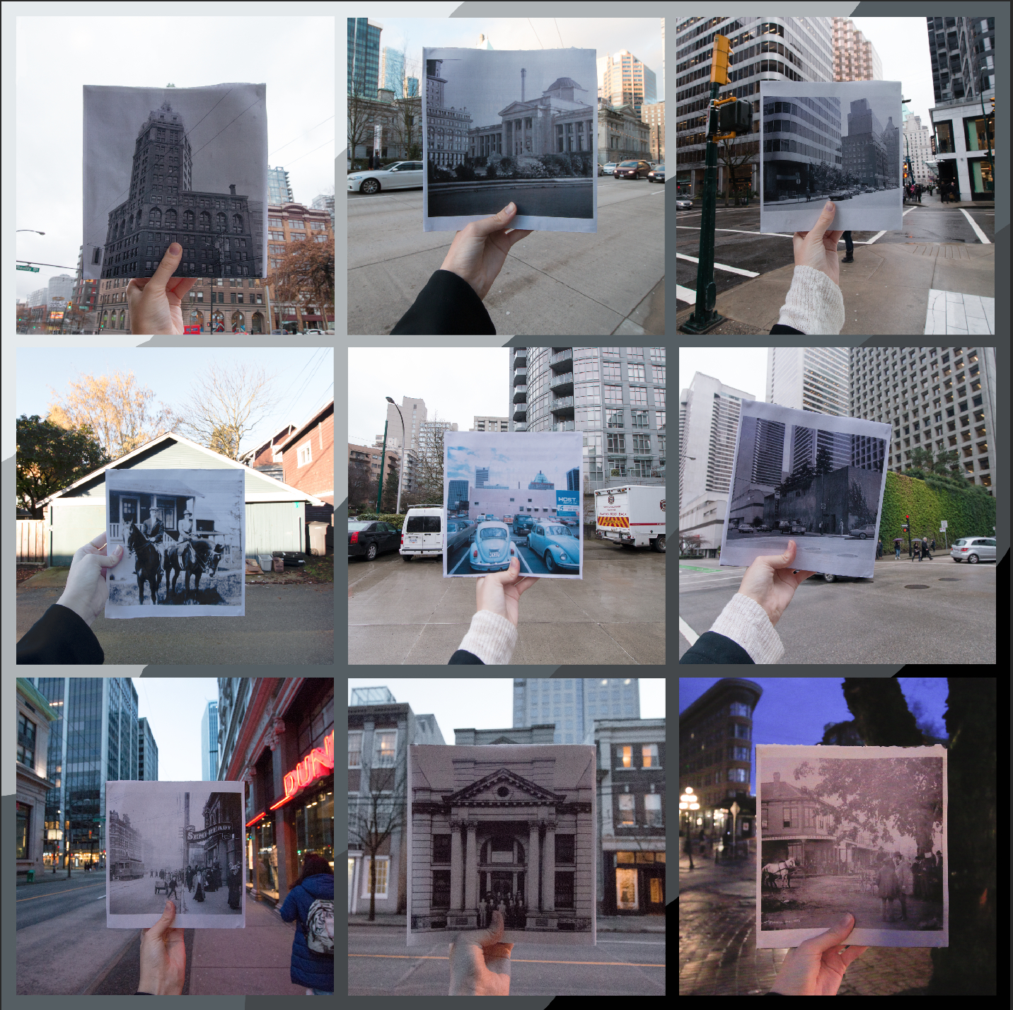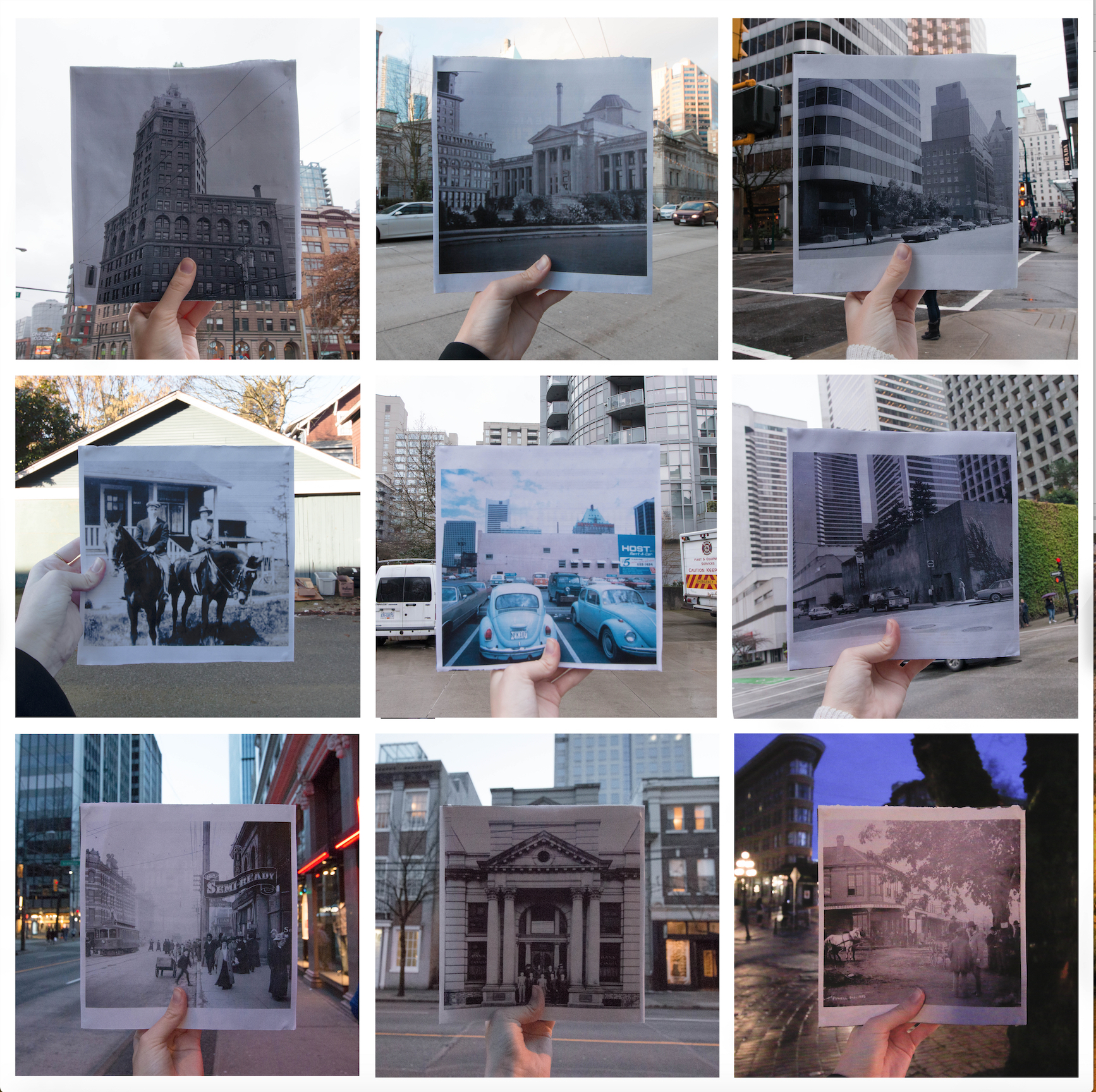 I matched the positioning of the buildings in the photos so that the changes that happened over time would be more noticable. Some places got completely forgotten, some overruled by nature, some even remained unchanged, while others got erased completely (the photograph of the cars parked was taken at a spacious parking lot overseeing the Vancouver Hotel. Now it is a fire station surrounded by skyscrapers.)